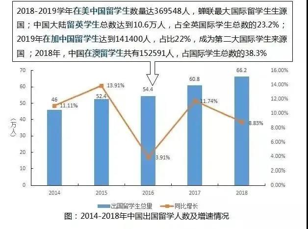 根据2019年美国《门户开放报告》显示,2018-2019学年在美中国留学生数量占国际学生总数的33.7% ,继续蝉联最大国际留学生生源国;而根据《2019年英国留学生报告》,中国大陆留英学生总数占全英国际学生总数的23.2%,增幅达12%,成为第一大来源国。