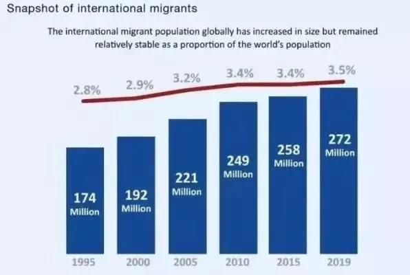 报告引用2019年联合国经社部关于全球国际移民存量的一项数据,截至2019年,全球的国际移民已经达到2.72亿人,占全球人口的3.5%。