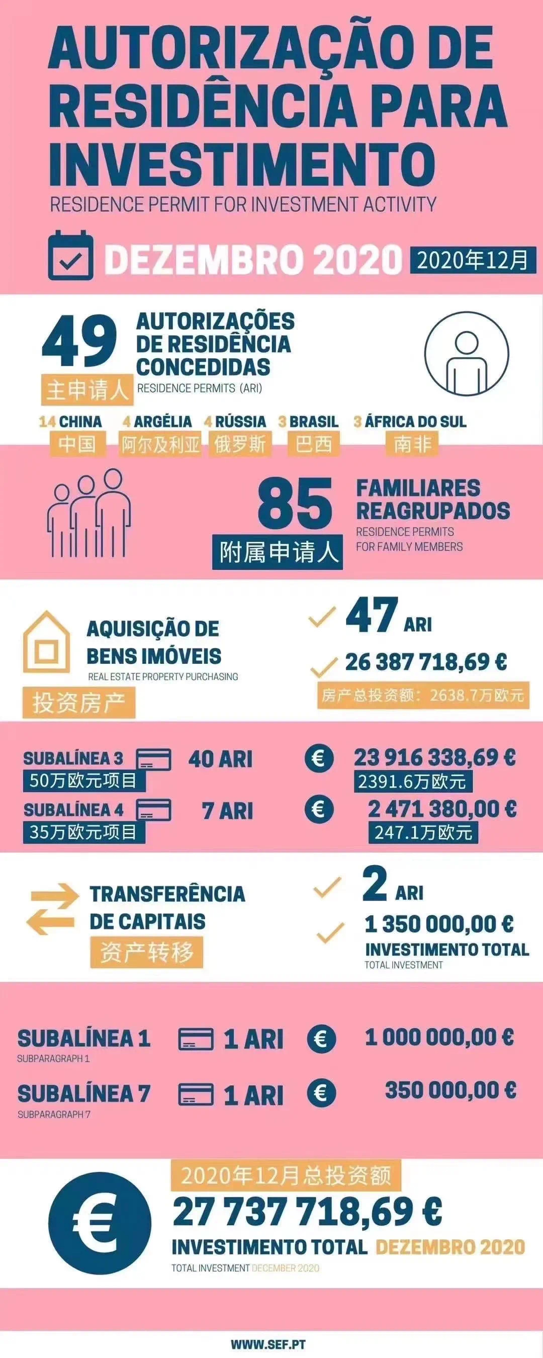 根据12月葡萄牙SEF公布了葡萄牙12月黄金签证获批数据。数据显示,2020年12月,共计49位主申请人获批葡萄牙黄金签证,携带的附属申请人获批人数为85位。主要还是以房产投资为主。47人是通过购房获得身份,投资金额高达2639万欧元!